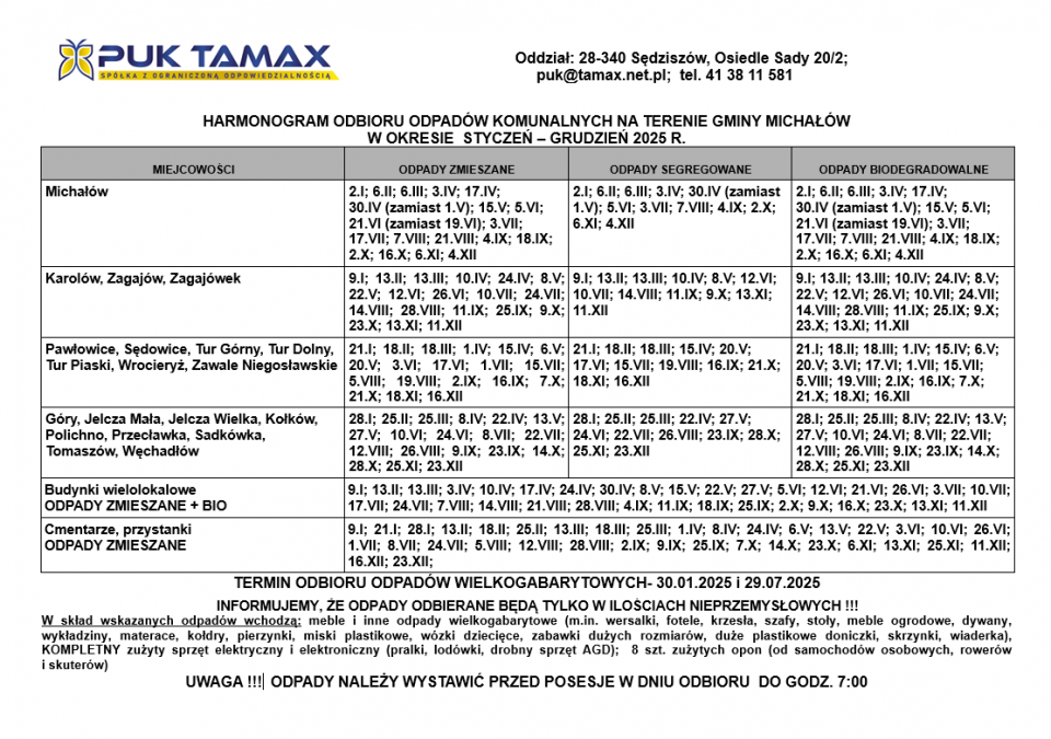 HARMONOGRAM ODBIORU ODPADÓW KOMUNALNYCH NA TERENIE GMINY MICHAŁÓW W OKRESIE STYCZEŃ – GRUDZIEŃ 2025 R.